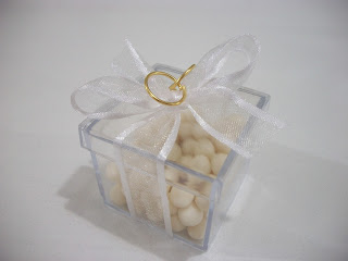 Que tal uma mesa repleta de caixas de acrílico, com confeitos de chocolate branco, envolta em fita de voal branca e um par de alianças simbolizando a união do casal para oferecer aos convidados do casamento?